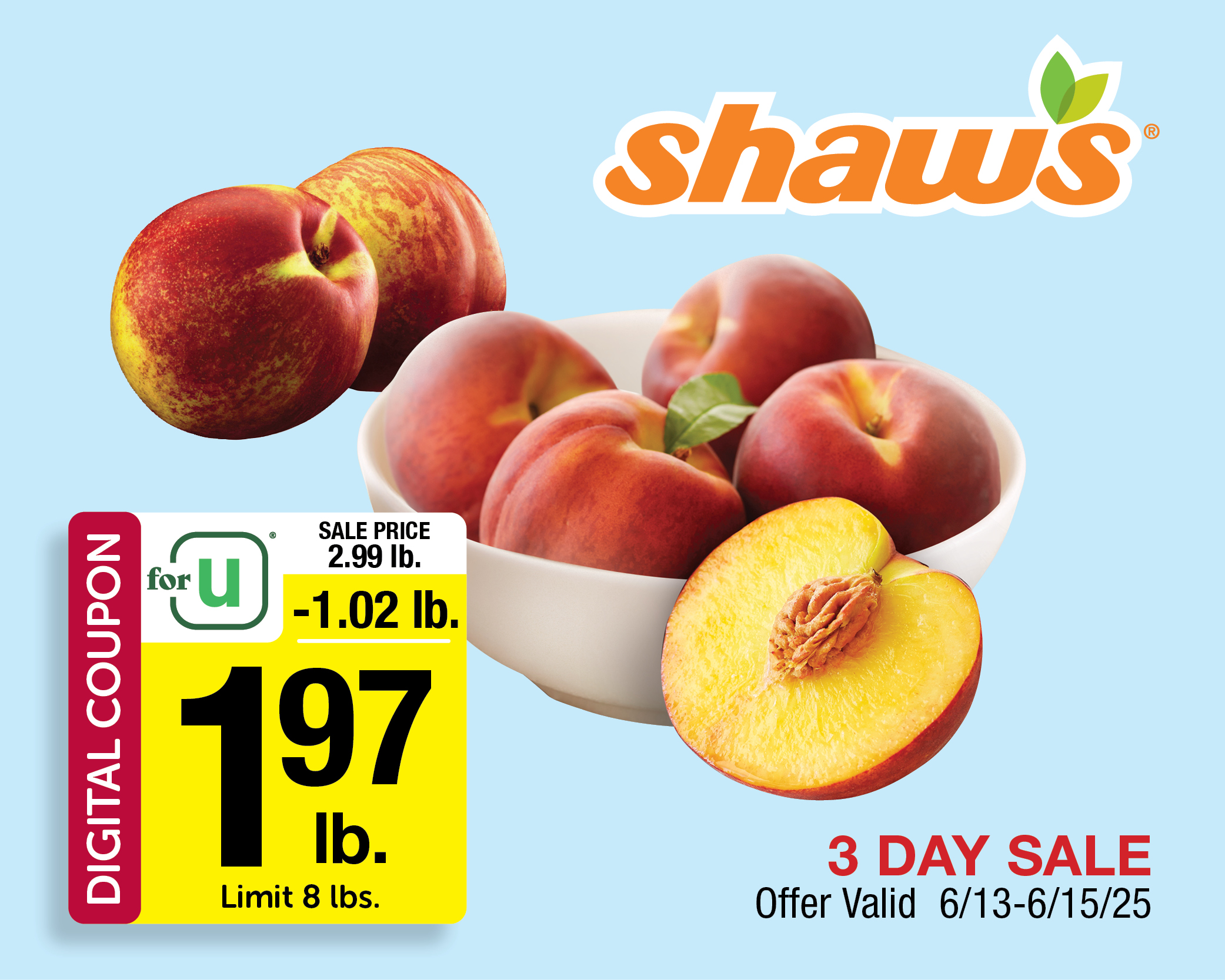 Featuring California Peaches or Nectarines at $1.97 lb. limit 8 lbs., with Shaw's for U™ digital coupon. Plus, check out the savings on Beef New York Strip Steak and all of your Father's Day favorites!